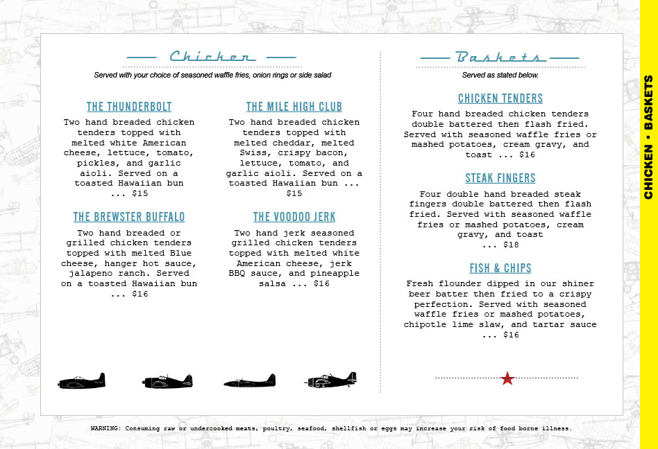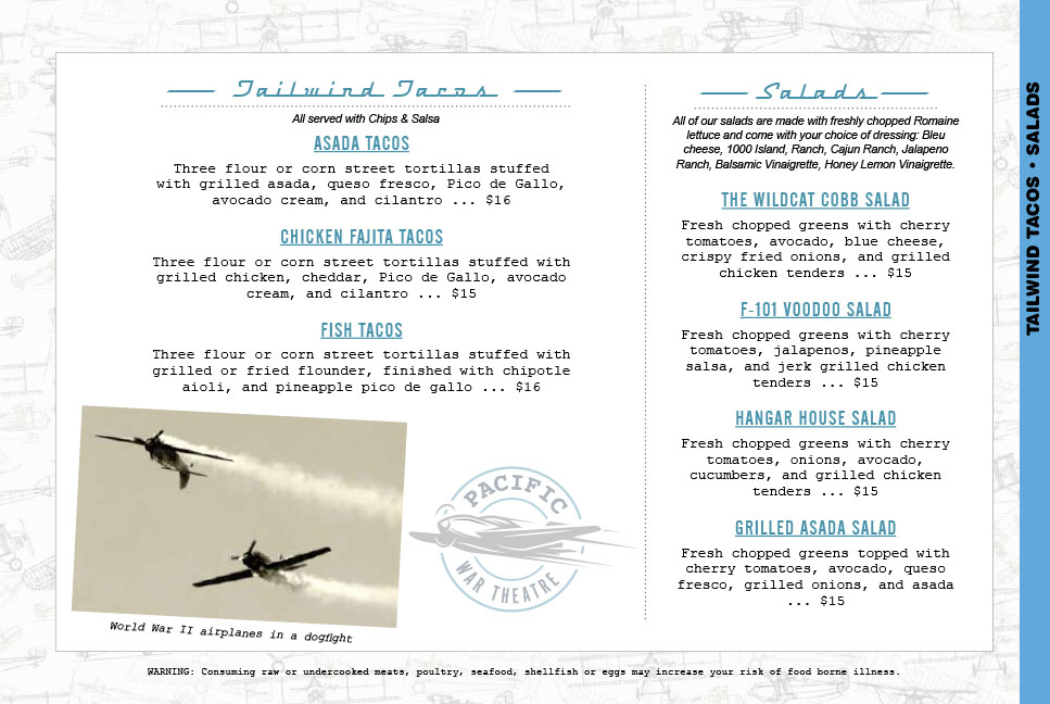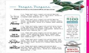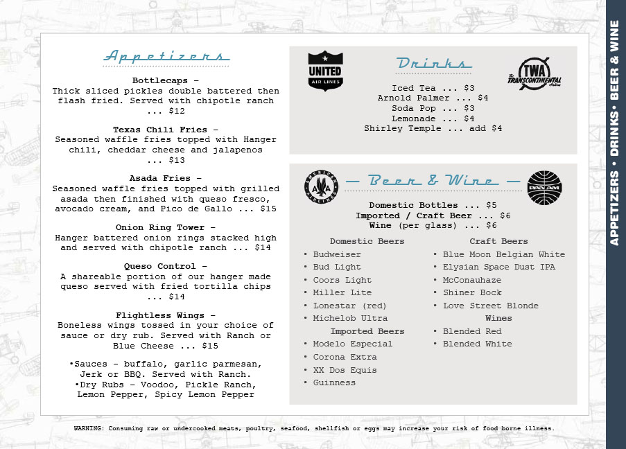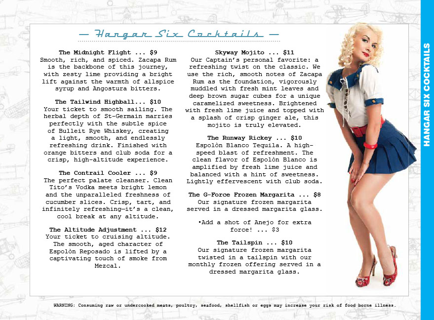 Hangar 6 Air Cafe Menus10 February,2018LynnFleck Order Delivery Order Carryout Downloadable menu view Hangar Cocktails Jim Gerrish December 11, 2025 view Hangar Burgers LynnFleck February 12, 2018 view Chicken & Baskets LynnFleck February 12, 2018 view Tacos and Salads LynnFleck February 12, 2018 view Desserts, Sides & Kids’ Meals LynnFleck February 12, 2018 view Appetizers and Drinks LynnFleck February 12, 2018